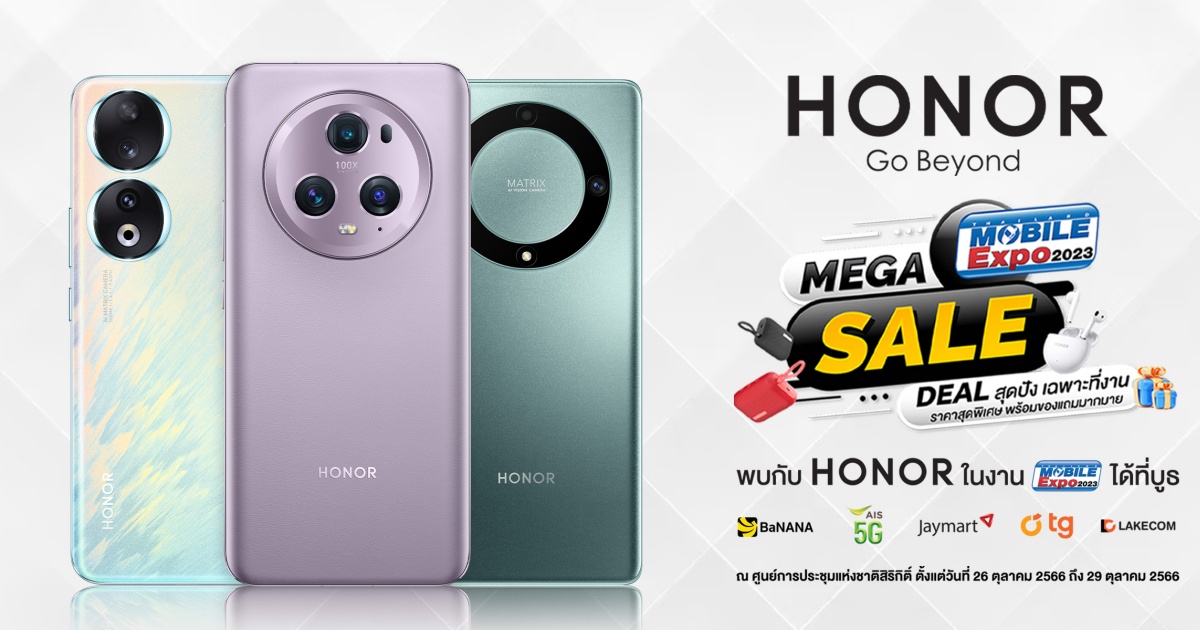 ออเนอร์ (HONOR) ผู้ให้บริการอุปกรณ์อัจฉริยะชั้นนำระดับโลก จัดโปรโมชันสุดโหด HONOR Go Beyond ส่งท้ายปีเอาใจลูกค้าในงาน Thailand Mobile Expo 2023 มหกรรมโทรศัพท์มือถือที่ใหญ่ที่สุดในประเทศ ณ ศูนย์ประชุมแห่งชาติสิริกิติ์ ระหว่างวันที่ 26 – 29 ตุลาคม นี้ กับ MEGA SALE ส่วนลดพิเศษมูลค่าสูงสุดถึง 5,000 บาท และของสมนาคุณเพิ่มเติมมากมาย โดยทุกท่านสามารถพบกับสินค้าและผลิตภัณฑ์ทุกไลน์อัพของ HONOR ที่จัดเต็มด้วยนวัตกรรมล้ำสมัยและขุมพลังชั้นยอด พร้อมรองรับบริการ Google Mobile Service เต็มรูปแบบ ได้ที่บูธตัวแทนจำหน่าย ทั้ง BaNANA, AIS, Jaymart, TG Fone และ LAKECOM กับโปรโมชันเด็ดดังนี้